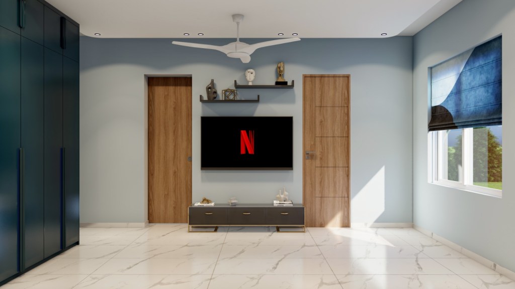 Stylish bedroom design featuring a tufted headboard, modern decor, and ample natural light.Modern bedroom featuring a television, closet, and stylish decor.