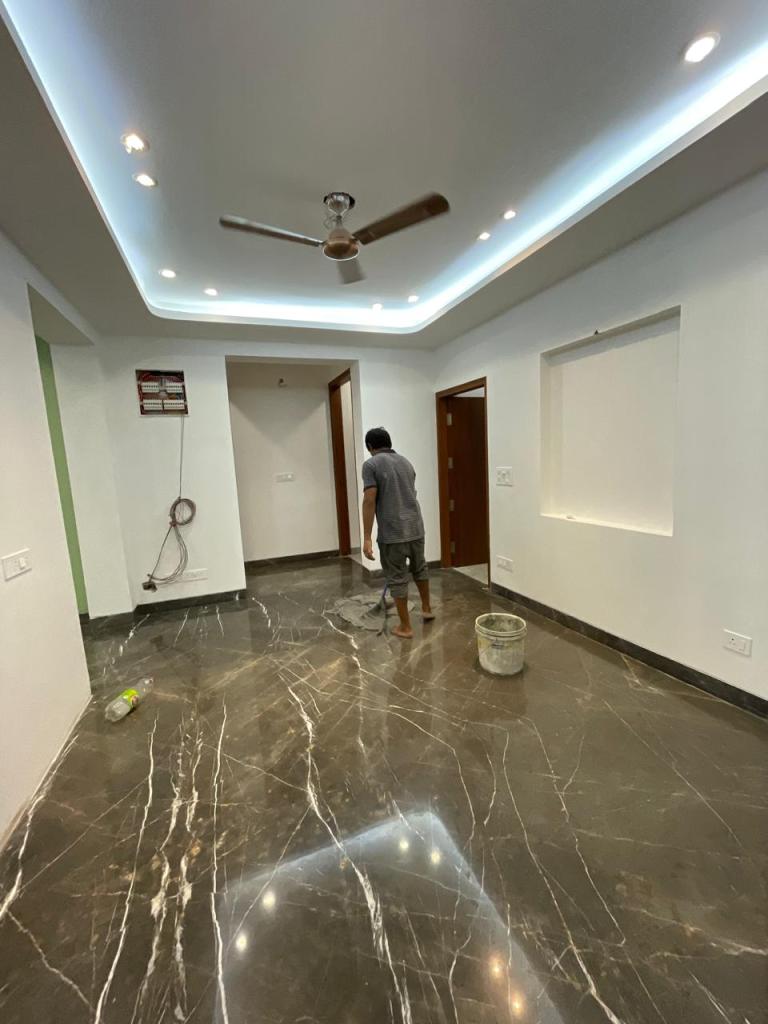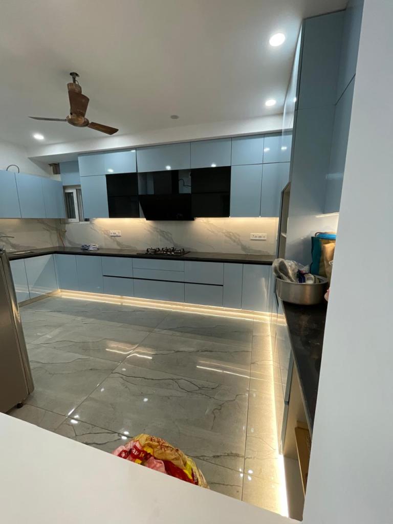Modern kitchen featuring sleek blue cabinetry, marble countertops, and ambient lighting.